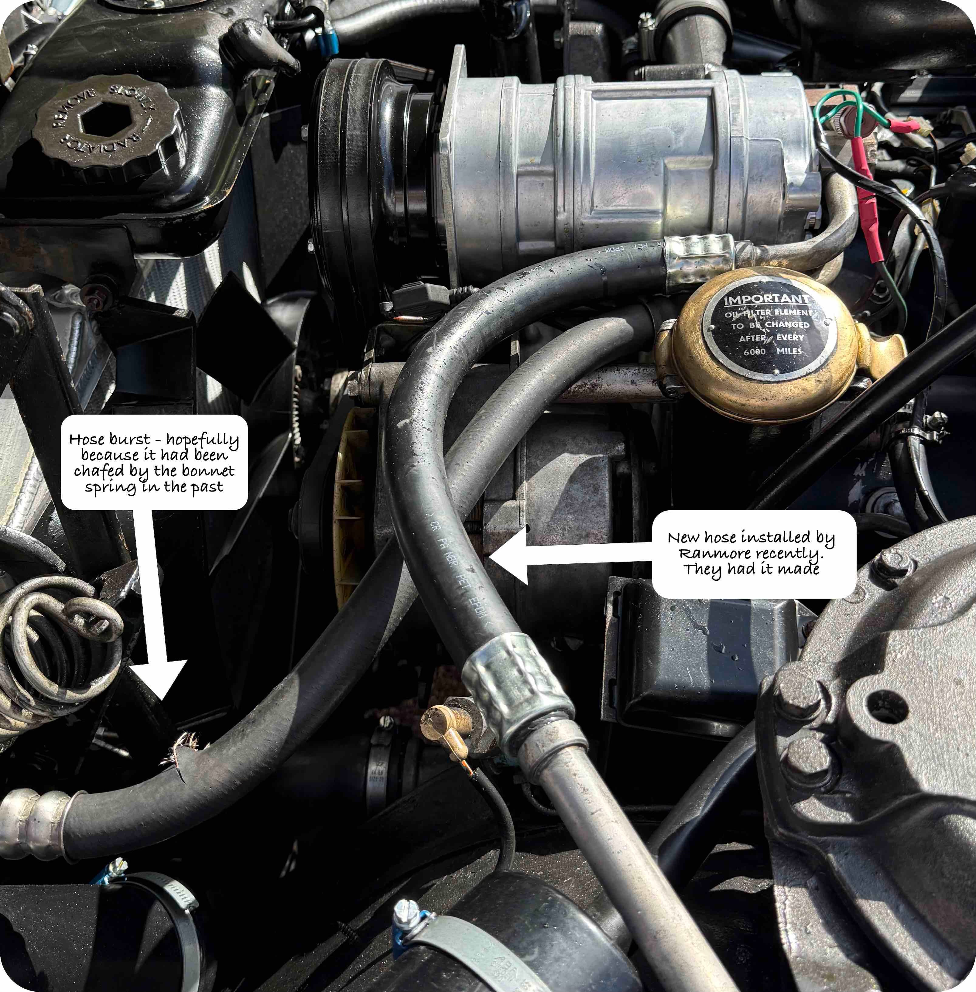 I’m hoping the hose burst was down to previous chafing by the bonnet spring – something I should have relocated earlier. Looks like I’ll need this one custom-made, as no original hoses are available. Ranmore had to fabricate a new low-pressure hose when fitting the latest compressor, so that’s probably for the best given the age of the originals.